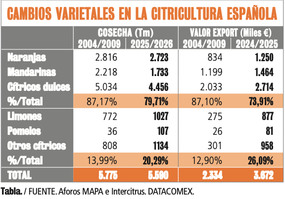 Durante estas dos décadas el panorama citrícola español ha evolucionado y lo ha hecho en dos direcciones fundamentalmente, en el terreno varietal (Tabla 1) y en la localización geográfica de la producción. En el último quinquenio de actividad del primer Intercitrus, los cítricos dulces representaban el 87% de la producción y el valor de sus exportaciones era el 87% del total. La campaña actual los otros cítricos representan el 20% de la cosecha y la campaña pasada el valor de las exportaciones de los otros cítricos fue del 26% sobre el total.