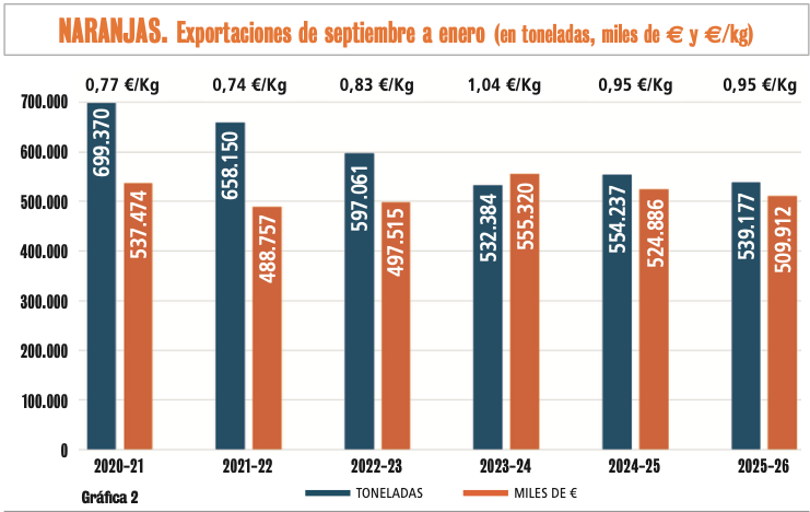Si observamos ahora en la Gráfica 2 el histórico de las exportaciones de naranjas en volumen de toneladas, miles de € y €/kg, vemos que el descenso de las exportaciones en toneladas es evidente, el valor económico de ellas se mantiene gracias al incremento de precios por lo que es muy difícil imaginar que teniendo en cuenta que las hectáreas son similares, alrededor de las 145.000, el margen se reduce porque los costos en estos años claramente se han incrementado.