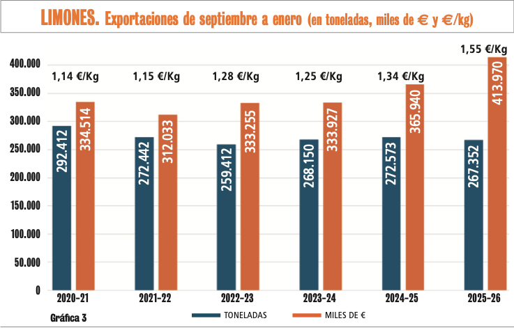 En el periodo contemplando las hectáreas han tenido unas pequeñas oscilaciones, pero se han mantenido entre las 51.000 y las 54.000. Pero, como vemos nítidamente, no sólo han subido los precios de venta sino que, a pesar de una estabilización de los volúmenes exportados en toneladas, el valor total de las exportaciones en los 5 meses de campaña analizados ha tenido una tendencia al alza. Sin lugar a duda, y desde hace ya más de 15 años, los limones son la familia citrícola española con mejor comportamiento.