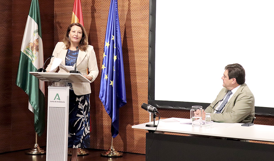 La consejera presentando en Jaén el primer aforo de aceite de oliva de la campaña 2020-21. / JUNTA DE ANDALUCÍA