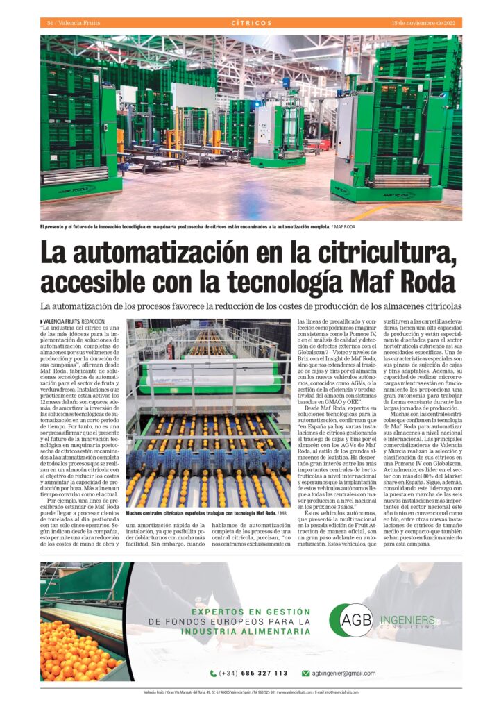 Desde Maf Roda, multinacional experta en ofrecer soluciones tecnológicas para la automatización, confirman que “en España ya hay varias instalaciones de cítricos gestionando el trasiego de cajas y bins por el almacén con los AGVs de Maf Roda, al estilo de los grandes almacenes de logística. Ha despertado gran interés entre las más importantes centrales de hortofrutícolas a nivel internacional y esperamos que la implantación de estos vehículos autónomos llegue a todas las centrales con mayor producción a nivel nacional en los próximos 3 años.”