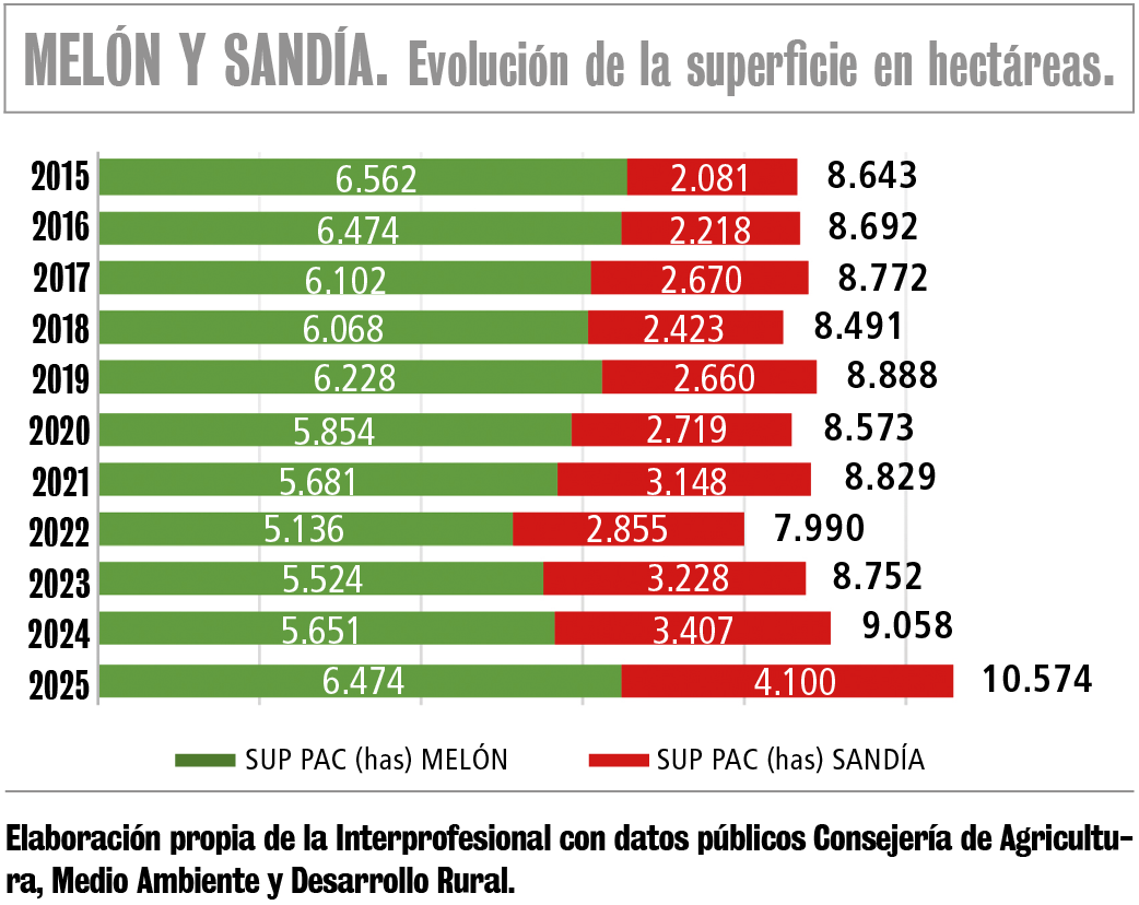 Según los datos de la declaración de ayudas de Pago Único (PU), la superficie cultivada de melón y sandía en la región alcanzó en 2025 las 10.574 hectáreas, lo que supone un incremento del 17% respecto a la campaña anterior y el mayor registro de los últimos once años. De ese total, 6.474 hectáreas correspondieron al melón, con un aumento del 15%, y 4.100 hectáreas a la sandía, que creció un 20% interanual.