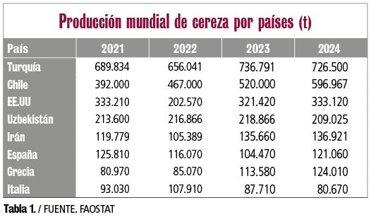 La cereza se ha convertido en uno de los cultivos de mayor valor añadido dentro del panorama frutícola internacional, y la evolución de los últimos años así lo demuestra. Entre 2021 y 2024, los principales países productores han mantenido una tendencia ascendente o, al menos, estable. Turquía, Chile y Estados Unidos están a la cabeza, aunque con matices que muestran cómo cada país ha ido ajustando su capacidad productiva en función del clima y de la demanda.