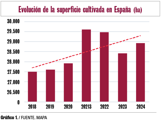 Más allá del contexto internacional, el sector español continúa mostrando una evolución positiva. La superficie sigue creciendo de forma sostenida, impulsada por zonas como Extremadura, Aragón y Cataluña, y la producción también sigue una senda ascendente, según datos del MAPA.