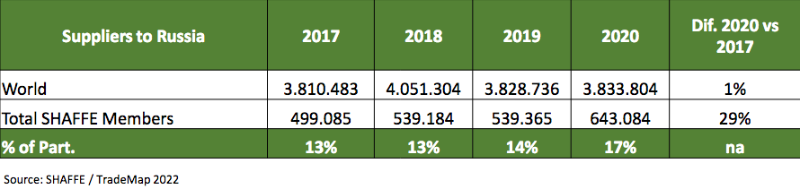 En 2020, Ucrania importó 795 millones de dólares de fruta fresca con más del 48 % procedente de proveedores como Turquía (cítricos), Ecuador y Costa Rica (plátanos y piñas). Las exportaciones totales de fruta fresca de los países miembros de SHAFFE (Asociación de Exportadores de Frutas Frescas del Hemisferio Sur, una entidad comercial compuesta por las principales asociaciones comerciales de productos frescos de Argentina, Australia, Brasil, Chile, Nueva Zelanda, Perú, Sudáfrica y Uruguay) alcanzaron los USD $ 54 millones en 2020, lo que representa el 7% del mercado total de importaciones de frutas en Ucrania. Los principales proveedores de Ucrania desde los países miembros de SHAFFE incluyeron a Sudáfrica, que exportó principalmente cítricos por un valor de USD $ 16 millones y que representó el 30% del valor total de las exportaciones registradas por los países miembros de SHAFFE en 2020.