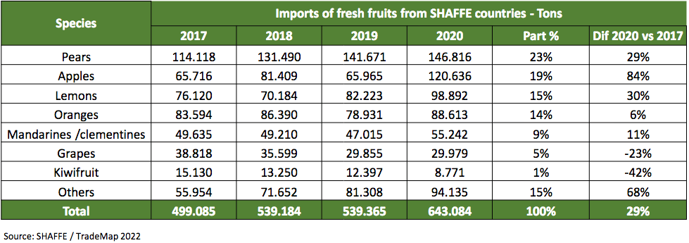 En 2020, las exportaciones de fruta fresca de los países miembros de SHAFFE a Rusia alcanzaron las 643.084 toneladas, lo que representó el 17% del mercado total de importación de productos frescos