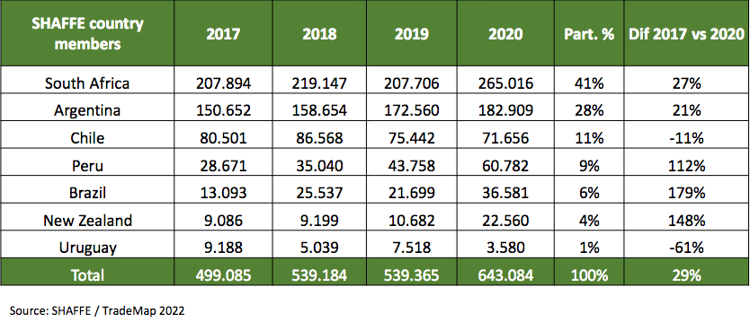 Durante el mismo período, las principales especies de frutas exportadas por los países miembros de SHAFFE a Rusia incluyeron manzanas, peras y cítricos, que en conjunto representaron el 80% de las exportaciones totales de los países miembros de SHAFFE a este mercado. Las exportaciones de productos frescos de los países miembros de SHAFFE han tenido una tendencia al alza, registrando un crecimiento del volumen del 29%, entre el período 2017 a 2020. Sudáfrica y Argentina son los principales proveedores de productos frescos a Rusia y representan el 69% del volumen total. exportado por los países miembros de SHAFFE en 2020.