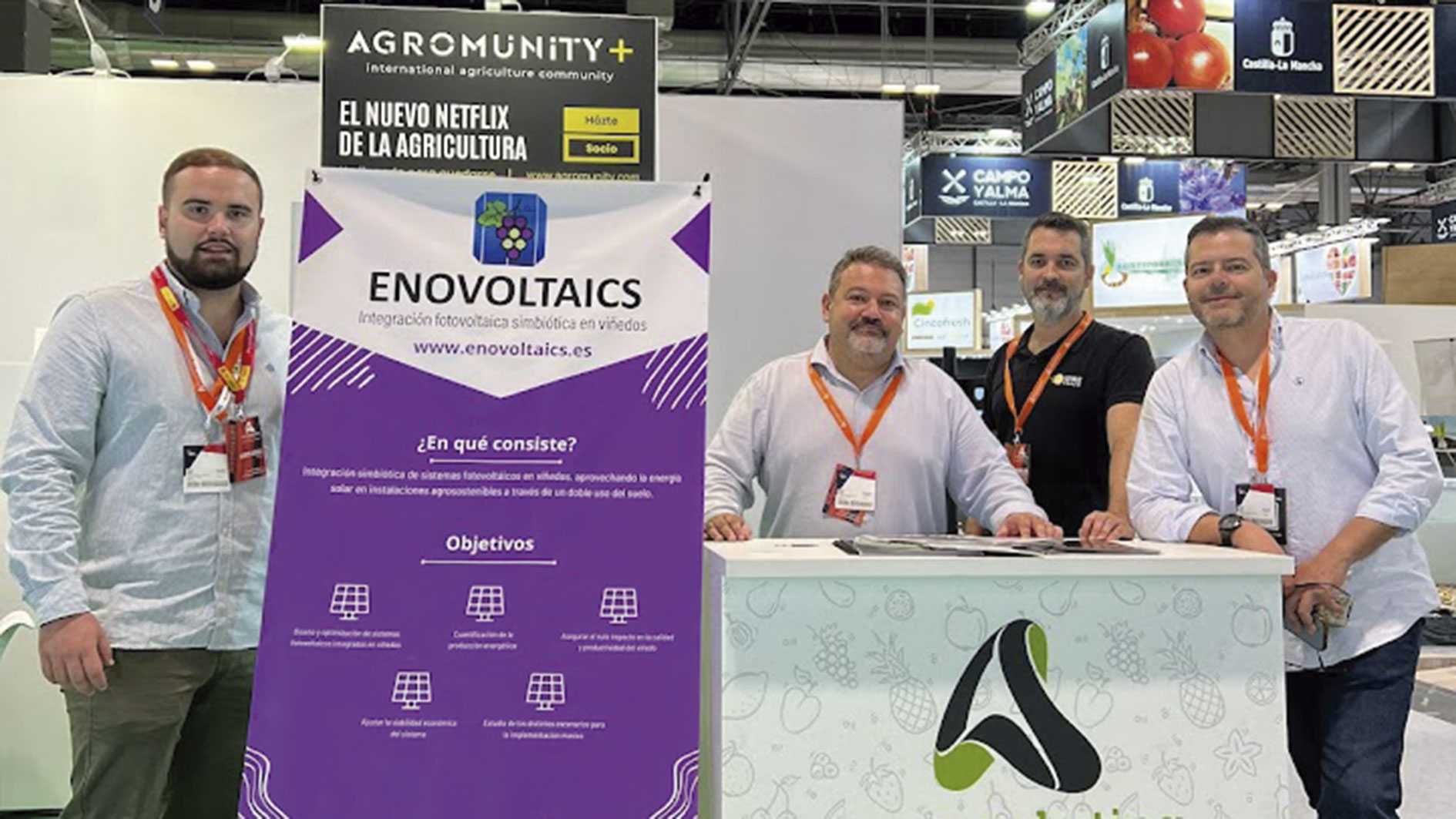 El Grupo Operativo Integración fotovoltáica simbiótica en viñedos (Enovoltaics) aprovechó Fruit Attraction de Madrid para presentar los resultados del primer año de andadura del proyecto que plantea la colocación vertical de instalaciones fotovoltaicas en viñedos, permitiendo un doble uso del suelo, tanto para producción energética como agrícola en plantaciones de vid en Jumilla y Yecla de la Región de Murcia.