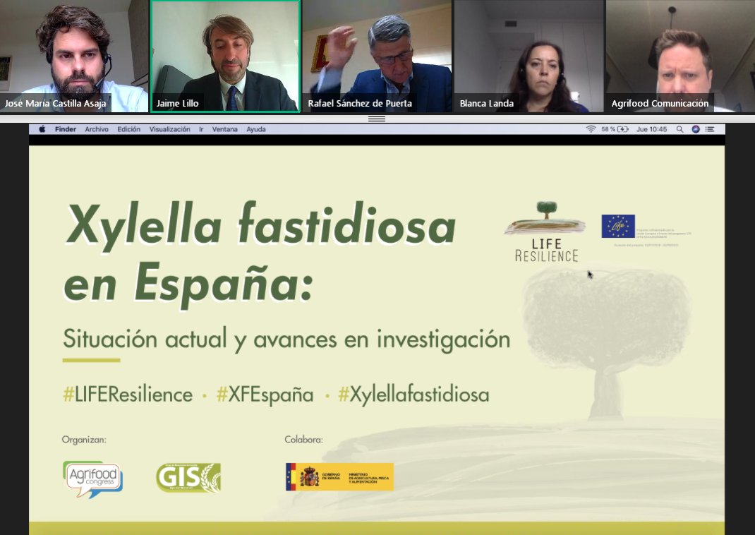 El proyecto LIFE Resilience, cofinanciado por el programa LIFE de la Unión Europea, cuyo principal objetivo es la prevención de Xylella fastidiosa en explotaciones de alta densidad tanto de olivar como de almendro; junto con la colaboración del Ministerio de Agricultura, Pesca y Alimentación y el Grupo de Innovación Sostenible para el sector alimentario (GIS), celebró el pasado jueves, 5 de noviembre una jornada online bajo el título “Xylella fastidiosaen España: situación actual y avances en investigación”, a la que asistieron más de 110 personas y que contó con la participación diversos expertos que trabajan actualmente en el control y prevención de la bacteria en nuestro país.