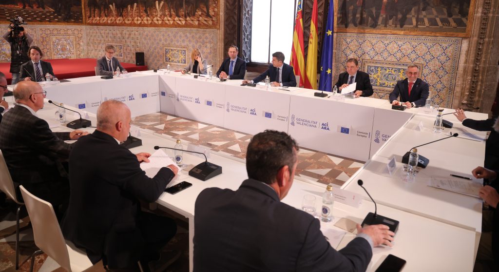 El comisario europeo de Agricultura, Christophe Hansen, se reunió en Valencia con el presidente de la Generalitat, Carlos Mazón; el ministro de Agricultura, Luis Planas, y con organizaciones agrarias y cooperativas. / GVA