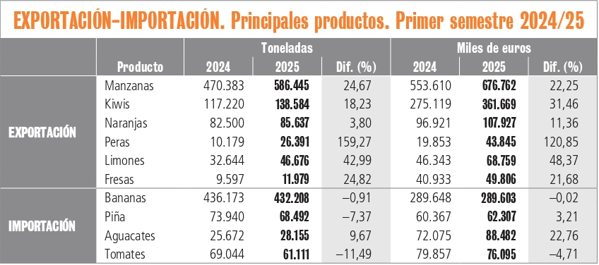 Las exportaciones crecieron en casi todas las categorías, con la fruta fresca como protagonista: +22% en volumen y +26,5% en valor. Las manzanas fueron el producto más dinámico, con un alza del 24,7% en cantidad y del 22,2% en valor, superando las 586.000 toneladas y los 676 millones de euros exportados.