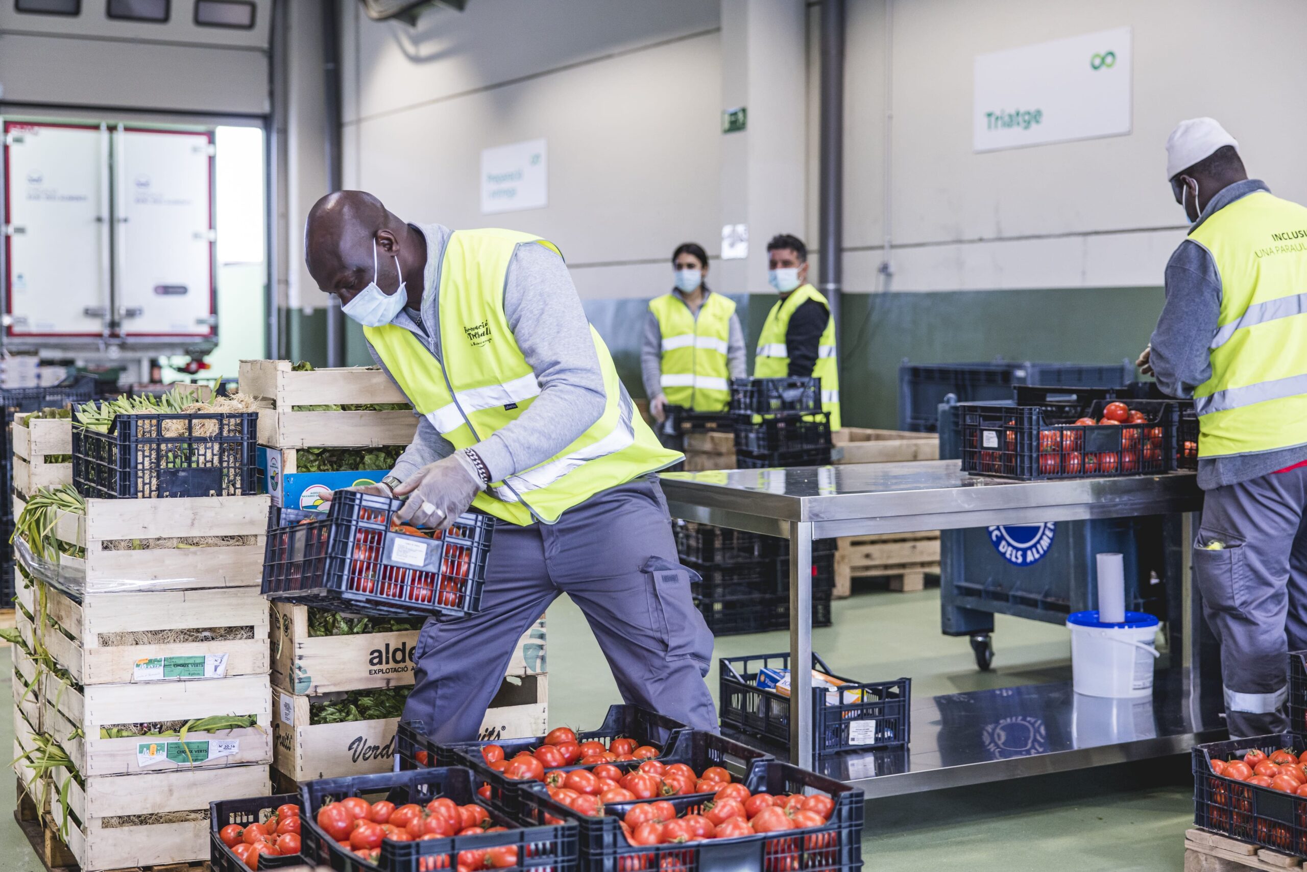 Los excedentes de frutas y hortalizas de los mayoristas se recogen en una nave de 900 metros cuadrados que Mercabarna construyó específicamente para este tema. Allí, se eligen los alimentos que pueden tener una segunda vida y se separan de los que van al punto verde para materia orgánica. Esta tarea la realizan personas en situación de vulnerabilidad que trabajan en la Fundación Formació i Treball. El Banc dels Aliments es quien coordina la instalación y organiza la distribución para que los alimentos lleguen a las personas que más lo necesitan de Barcelona y su área metropolitana.