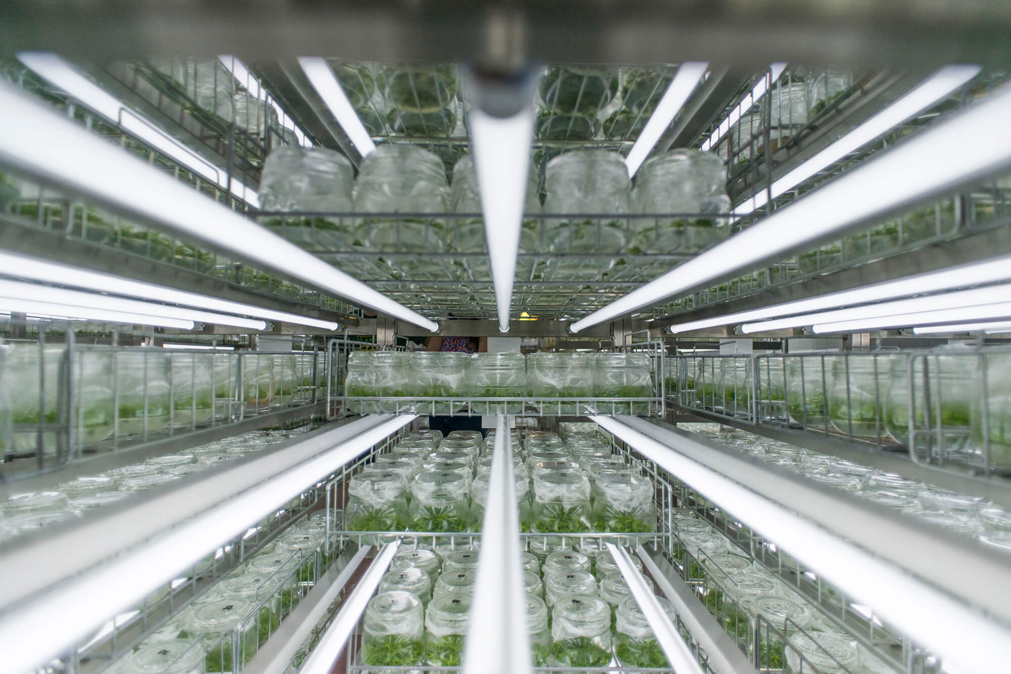 2. Cultivo en laboratorio. El fragmento se coloca en un medio nutritivo estéril dentro de frascos, bajo condiciones controladas de luz, temperatura y humedad. Esas células se estimulan para formar nuevos brotes.