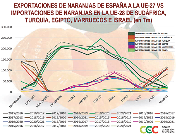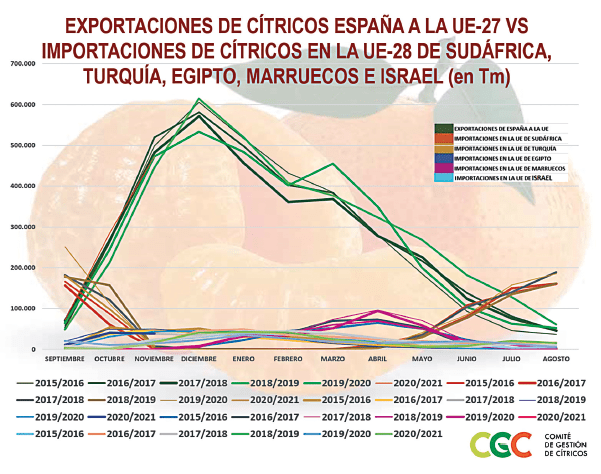 El principal vendedor de cítricos a la UE es Sudáfrica (SA), con un total de unas 800.000-1.000.000 toneladas de cítricos exportados anualmente a la UE en contraestación (en el verano del hemisferio norte), de un total de 2.100.000-2.150.000 Tm exportadas por Sudáfrica. Las importaciones medias anuales de cítricos procedentes de SA en la UE se han incrementado en 250.000 Tm en los últimos 5 años, un incremento de un 33,6% respecto a la media de los 5 últimos años. El periodo de importación se extiende fundamentalmente de mayo a octubre, siendo el periodo álgido de julio a octubre.