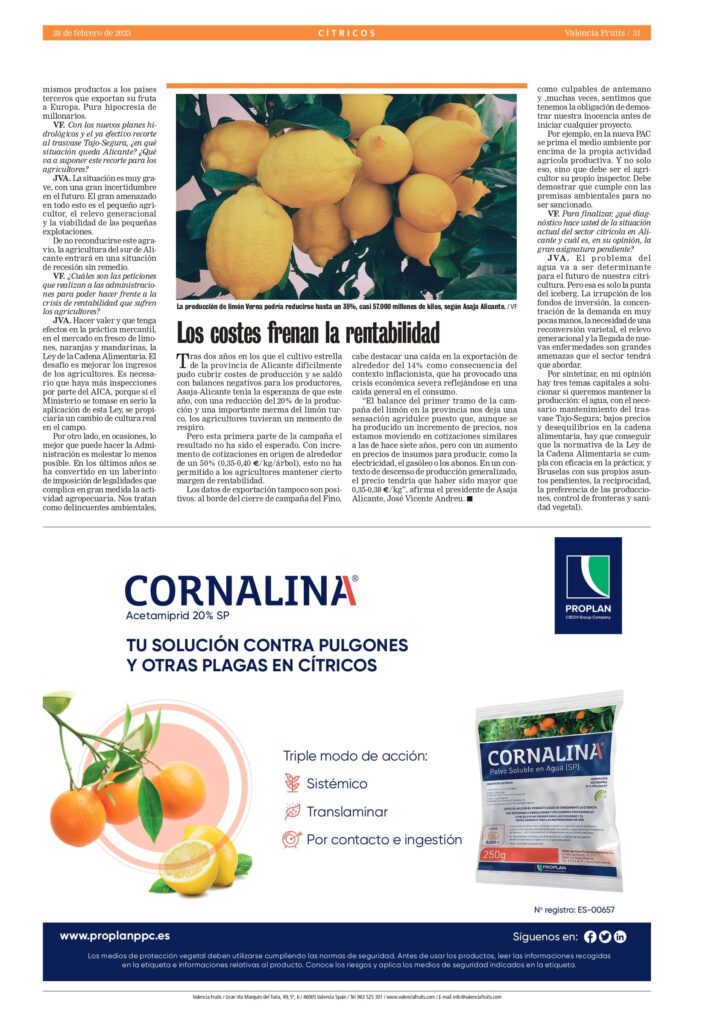 “El balance del primer tramo de la campaña del limón en la provincia nos deja una sensación agridulce puesto que, aunque se ha producido un incremento de precios, nos estamos moviendo en cotizaciones similares a las de hace siete años, pero con un aumento en precios de insumos para producir, como la electricidad, el gasóleo o los abonos. En un contexto de descenso de producción generalizado, el precio tendría que haber sido mayor que 0,35-0,38 e/kg”, afirma el presidente de Asaja Alicante, José Vicente Andreu.