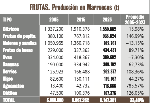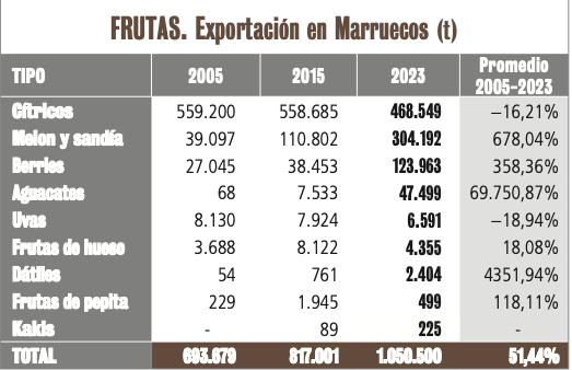 Podemos observar ahora (ver Tabla 2) la evolución de este mismo periodo de las exportaciones de frutas en total y la de las más importantes. En cítricos, las naranjas casi han desaparecido, ya que en 2005 se exportaban 256.000 toneladas y en 2023 sólo 38.000, habiendo cubierto gran parte de esa bajada las mandarinas, ya que limones y pomelos no son relevantes en Marruecos. En el grupo melones han sido las sandías las protagonistas de este crecimiento y una gran parte ha destacado con variedades sin semillas que, apoyándose en la precocidad de la zona sur del país, han ocupado parte del gran incremento de consumo que ha tenido la sandía en los últimos años, siendo Francia y España sus principales destinos.