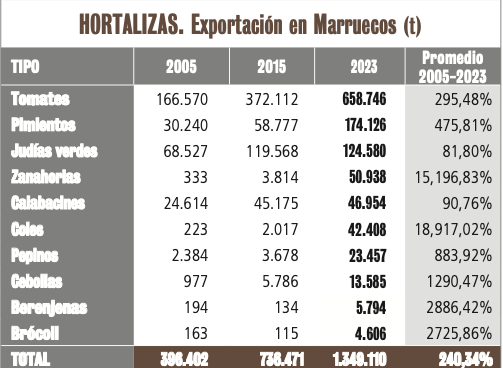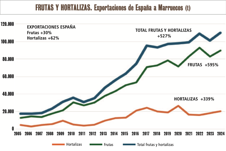 Sobre el total de las exportaciones españolas, Marruecos representa sólo el 0,9%, pero es cierto que ha tenido un crecimiento mucho mayor que la media, ya que, mientras España ha crecido en estos años en las exportaciones de frutas un 30%, las de Marruecos lo han hecho un 595% y en hortalizas España ha crecido un 62%, mientras que las dirigidas a Marruecos lo han hecho un 339%.