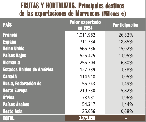 Francia y España suponen el 45%, mientras que entre el Reino Unido y Países Bajos ya suman un 29%. Las exportaciones a Estados Unidos y Canadá son básicamente cítricos. En conjunto, el continente europeo recibe el 88,8%; América, el 6,4%; África, el 2%; los países árabes, el 1,4%; y el resto de Asia, el 0,7%.