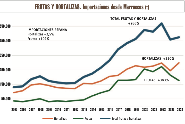Mientras que durante los últimos 20 años las importaciones de hortalizas españolas se han mantenido estables, por la bajada de las hortalizas secas (guisantes y habas secas), las importaciones que España ha realizado desde Marruecos han subido un 220%. En frutas, las importaciones españolas han subido un 102%, mientras que las de Marruecos lo han hecho un 383%.