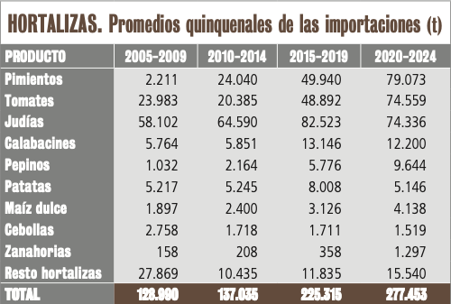 Sin embargo, las importaciones de hortalizas de Marruecos no son relevantes. El único producto que se puede destacar es el ajo, que ha pasado en estos años de 6.000 a 15.000 toneladas.