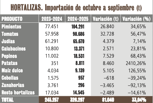 Si observamos en la Tabla 8 las dos últimas campañas de octubre a septiembre con detalle vemos que el crecimiento de las importaciones de hortalizas ha sido del 33%, si bien concentrado en pimientos, tomates, calabacines, pepinos, patatas y maíz dulce y estabilizado en judías, y en retroceso en cebollas, zanahorias y otras hortalizas.