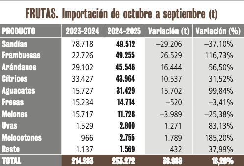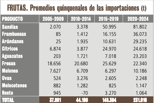 En la Tabla 10 se observa un retroceso en sandías, melones y fresas. Pero también un crecimiento que enlaza con la tendencia que hemos visto en el cuadro anterior en aguacates, arándanos y frambuesas. Los cítricos podrían suponer un crecimiento momentáneo, porque en la última década han presentado subidas y bajadas directamente relacionadas con la cosecha española.