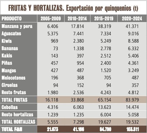 Que dentro de las frutas de pepita la manzana no haya crecido se debe al gran crecimiento de la producción local, que ha pasado de 300.000 toneladas a 860.000 en este periodo. Sin embargo, la producción de peras no ha crecido casi, por lo que sí lo han hecho de forma clara las importaciones.