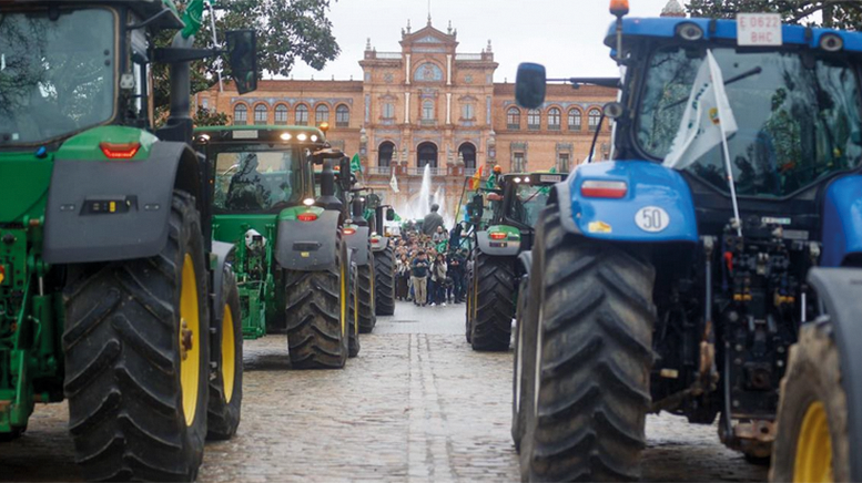 Alrededor de 200 tractores procedentes de distintos puntos de la provincia de Sevilla han llenado la Plaza de España de la capital andaluza en una protesta convocada por agricultores y cooperativas agrarias contra el acuerdo comercial entre la Unión Europea y Mercosur, los recortes en la Política Agraria Común (PAC) y para reclamar ayudas por las pérdidas millonarias que están provocando las continuas borrascas registradas en los últimos días.