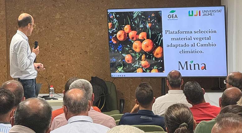 La presentación de la nueva variedad de mandarina protegida Mina, desarrollada por la empresa GEA Biotechnology en colaboración con la Universitat Jaume I (Castellón), reunió el pasado 24 de octubre en la sede de la Asociación de Empresarios Hortofrutícolas de Murcia a más de sesenta profesionales del sector, entre productores y exportadores de la Región de Murcia, así como técnicos y viveros.