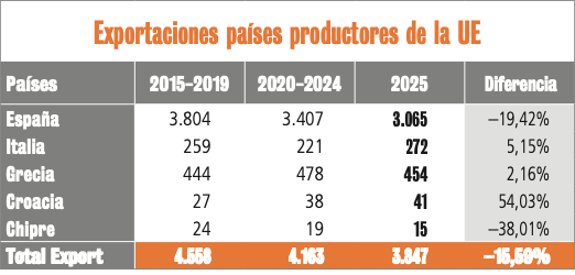 En la Unión Europea hay 7 países que producen cítricos: España, Italia, Grecia, Portugal, Francia, Croacia y Chipre. Francia, Croacia y Chipre prácticamente consumen sus cítricos en su propio mercado y Portugal tiene un gran intercambio con España tanto en exportación como en importación, con lo que su influencia con producto propio en Europa es muy pequeña. Los tres países que inciden en la Europa no productora son básicamente España, Italia y Grecia.