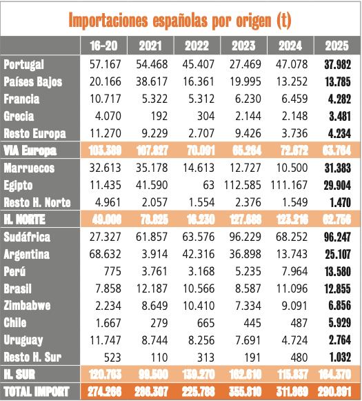 La fuerte bajada de Argentina, básicamente limones, ha sido compensada por Sudáfrica. Pero en el bloque de limones&limas es importante resaltar que, durante esta década analizada, en la primera parte las limas se movían alrededor de las 10.000 toneladas anuales y en la segunda parte lo han hecho en el entorno de las 15.000. Las limas proceden de Brasil y de Perú.
