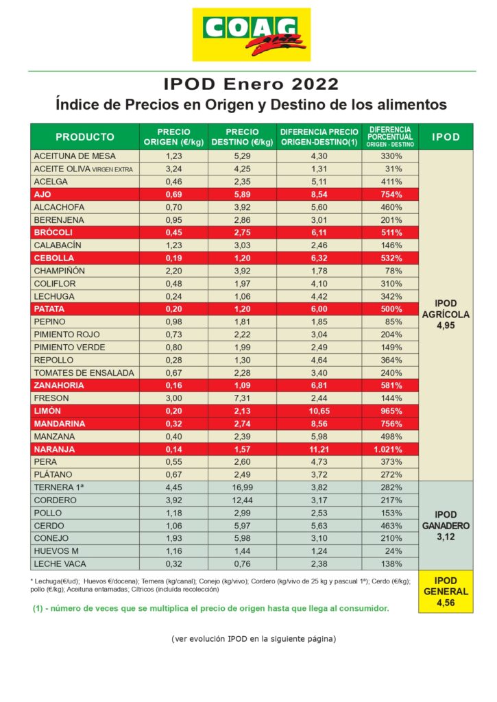 La Coordinadora de Organizaciones de Agricultores y Ganaderos (COAG) ha publicado el índice de precios en origen y destino de los alimentos referente a enero de 2022.