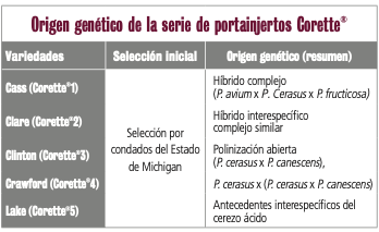 Frente a las limitaciones de los portainjertos GiSelA® en España, desde Agromillora se buscó una genética diferente, que es la serie Corette®. Se trata de una serie de cinco portainjertos denominados Cass, Clare, Clinton, Crawford y Lake, obtenidos por la Michigan State University (MSU) de Estados Unidos a partir de especies existentes en los centros de biodiversidad de Europa y Rusia. Su origen genético se indica en la tabla 1. Confieren una gama baja de vigor, muy inferior a SL-64 y Adara (patrones de referencia en España) e inferior a GiSelA®6.