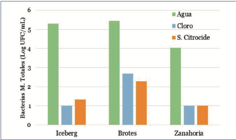 Figura 1. higiene del agua de lavado medida como Bacterias M. (Mesófilas) Totales (UFC/mL = unidades formadoras de colonias por ml) en 3 productos IV Gama: lechuga Iceberg cortada; Brotes tiernos y Zanahoria pelada; lavados con Agua, Cloro (80 ppm Cllibre) o con el Sistema Citrocide® FRESH-CUT.