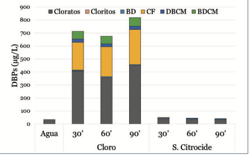 Figura 2. concentración de productos derivados de la desinfección (DBPs) en el agua de lavado de Brotes tiernos después de 30, 60 y 90 minutos de lavado usando Cloro como desinfectante (80 ppm Cllibre) o el Sistema Citrocide® FRESH-CUT. Agua = contenido básico de DBPs en el agua de red. (BD + CF + DBCM + BDCM = Trihalometanos).