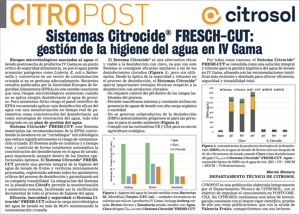 Sistema Citrocide® FRESH-CUT: este Sistema materializa las recomendaciones de la EFSA convirtiendo la lavadora en un “cortafuegos” microbiológico que reduce significativamente el riesgo de contaminación cruzada. El Sistema mide en continuo y a tiempo real, y controla de forma totalmente automática la concentración del desinfectante en el agua de lavado, para mantenerlo siempre dentro de los límites operacionales óptimos. El Sistema Citrocide® FRESH-CUT permite una gestión integral de la higiene del agua de lavado de frutas y verduras mínimamente procesadas, registrando además todos los parámetros críticos del proceso de desinfección y garantizando así su completa trazabilidad. La integración del Sistema en la plataforma CitroFy permite la monitorización y asistencia remotas, facilitando así la verificación documental de todo el proceso de higiene del agua.