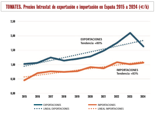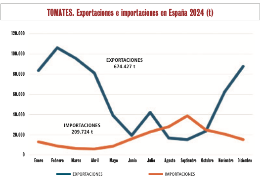 Si observamos la evolución durante estos años de las exportaciones e importaciones de tomates en España, la imagen que obtenemos es el Gráfico 1, donde vemos que hay un descenso claro de las exportaciones, aunque se aprecia que en el 2024 hay una recuperación con lo que se aproxima a las cifras del 2021, después de haber bajado en el 22 y el 23. Por otro lado, observamos como las cifras de importación se mantienen prácticamente estables.