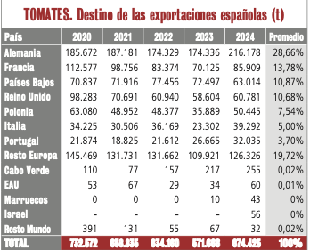 El 99,94% de las exportaciones españolas de tomate van a Europa y los 5 primeros países acumulan el 72%. Es remarcable el caso de Italia, que importó el año pasado casi 40.000 toneladas, ocupando la 6ª posición.