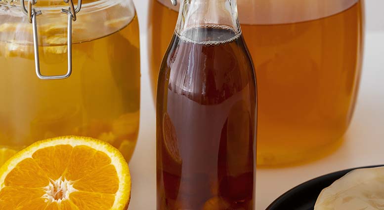 Esta bebida probiótica fermenta directamente sobre el zumo de la propia fruta y combina las propiedades del té con los compuestos bioactivos de fresas y naranjas