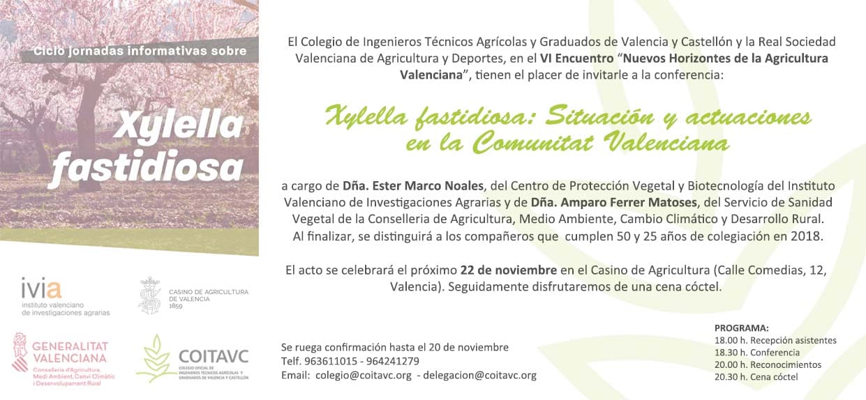 La Xylella sigue avanzandoy desde el sector se sigue trabajando a contrarreloj para, con distintas actuaciones, frenar al máximo su expansión. Y una de esas actuaciones es la de aportar la máxima información a técnicos, agricultores y viveristas. Es lo que está haciendo el Consejo de Ingenieros Técnicos Agrícolas de la Comunitat Valenciana en numerosas jornadas informativas que ya han pasado por Vinaròs, Alicante, Ontinyent, Villena y que hoy, jueves, llegan a Valencia.